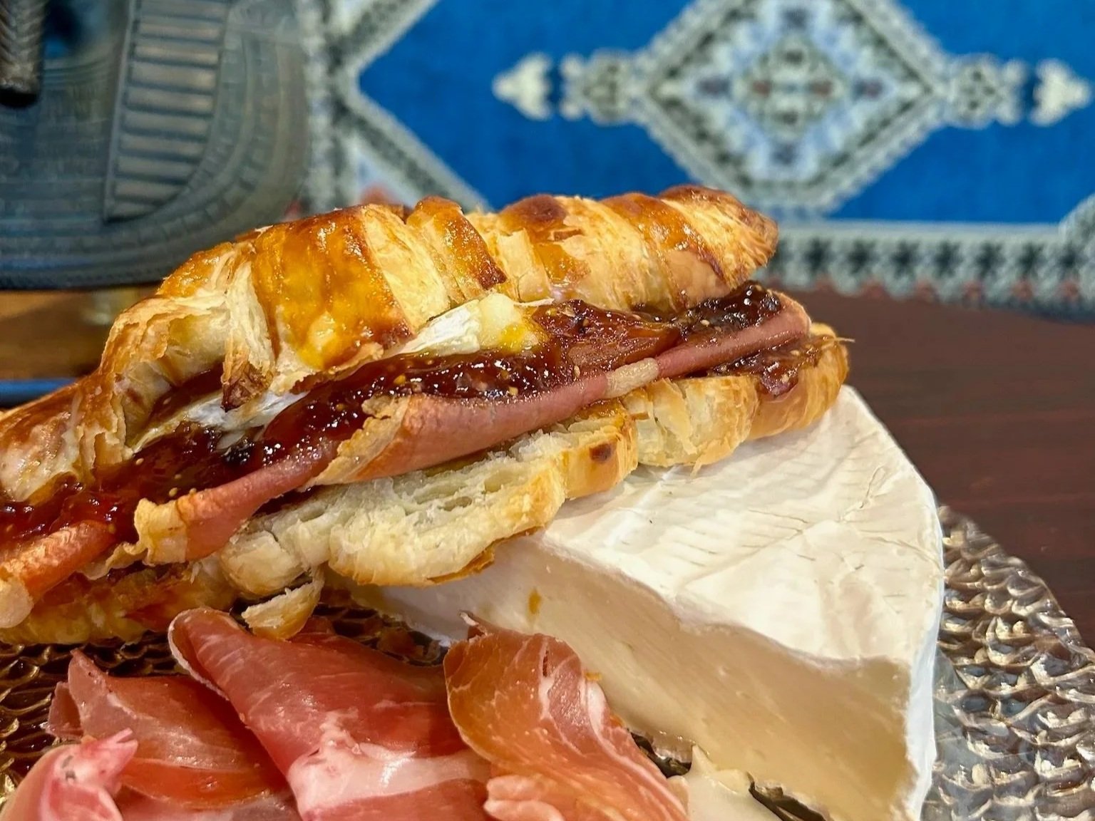 Fresh Proscuitto, Brie, Crisp Sliced Green Apple, Fig Jam Spread on a Freshly Baked Croissant